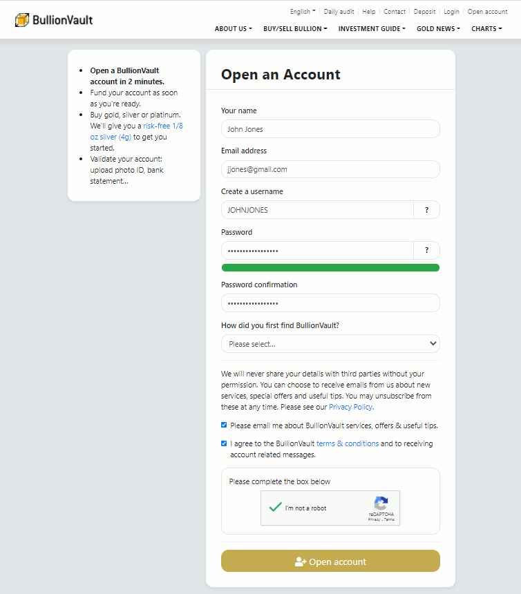• We keep the account opening process as short as possible to allow you to get on and use the BullionVault system fast.